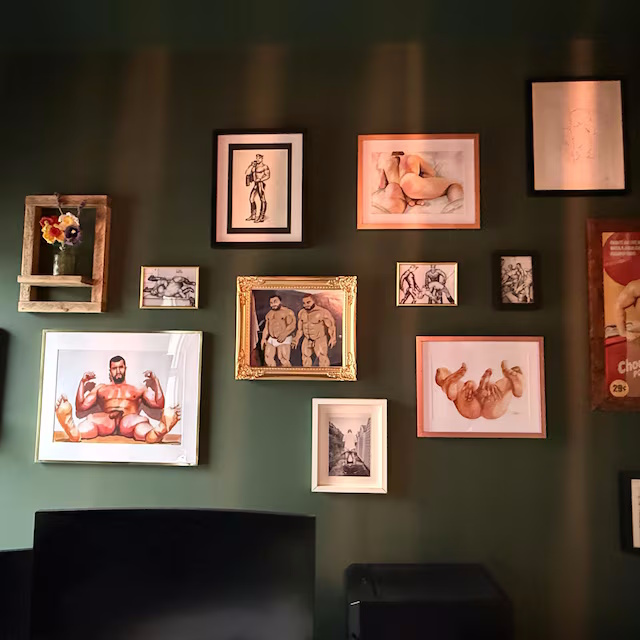 Framed beautifully and surrounded by other artworks, the prints create a bold, intimate atmosphere—celebrating the beauty of the male form through queer art. The arrangement is not only elegant but deeply personal, blending erotic male art with thoughtful interior design.